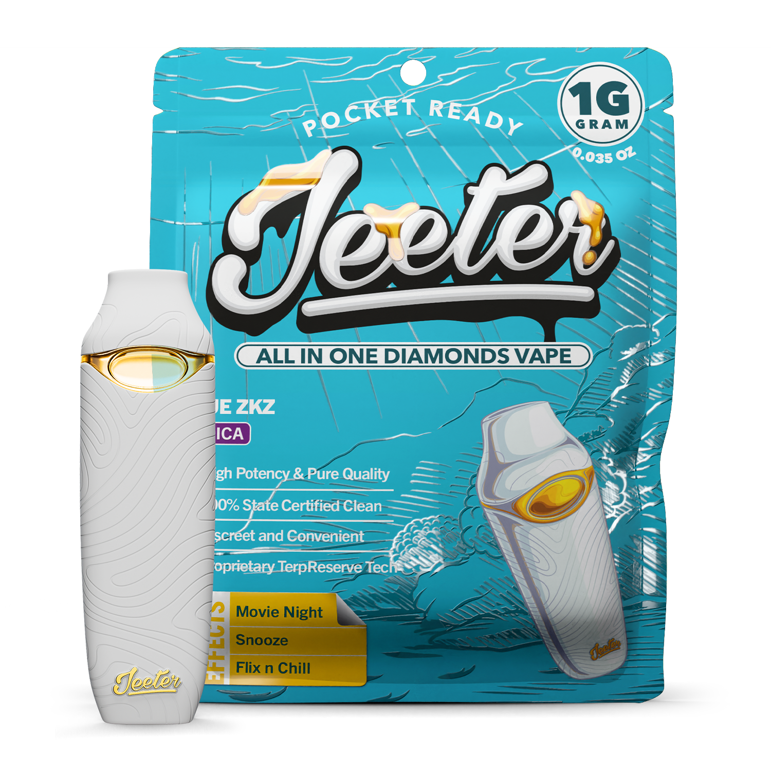 Blue ZKZ live resin vape by Jeeter crafted with high-quality cannabis extract, delivering potent effects, sweet berry and fruity terpene flavor, and a smooth, flavorful vaping experience.